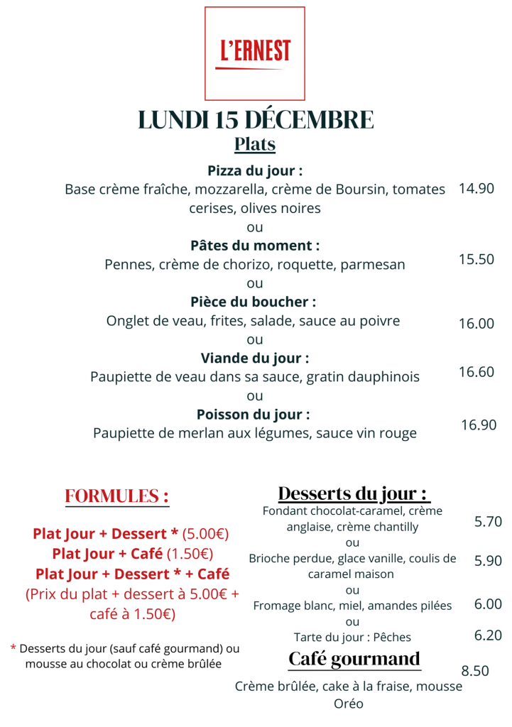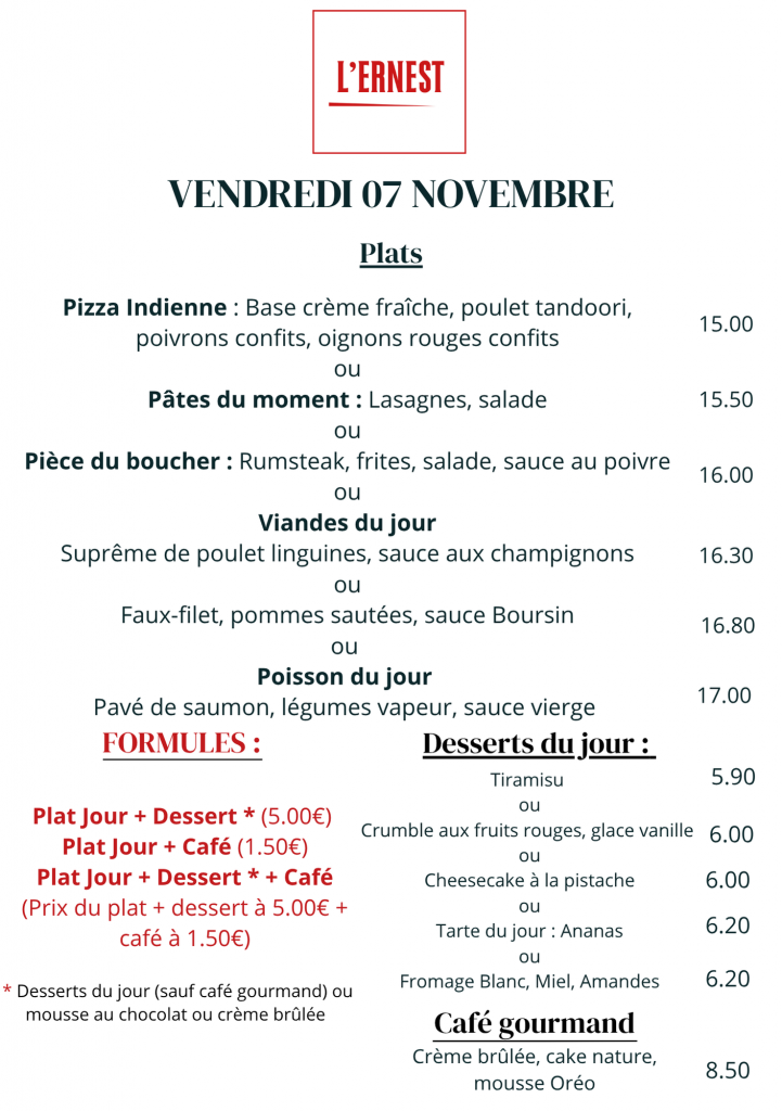 L’Ernest vous accueille du lundi au vendredi de 7h à 1h du matin et samedi et dimanche de 8h à 1h du matin (service continu de 11h30 à 23h30 tous les jours).
