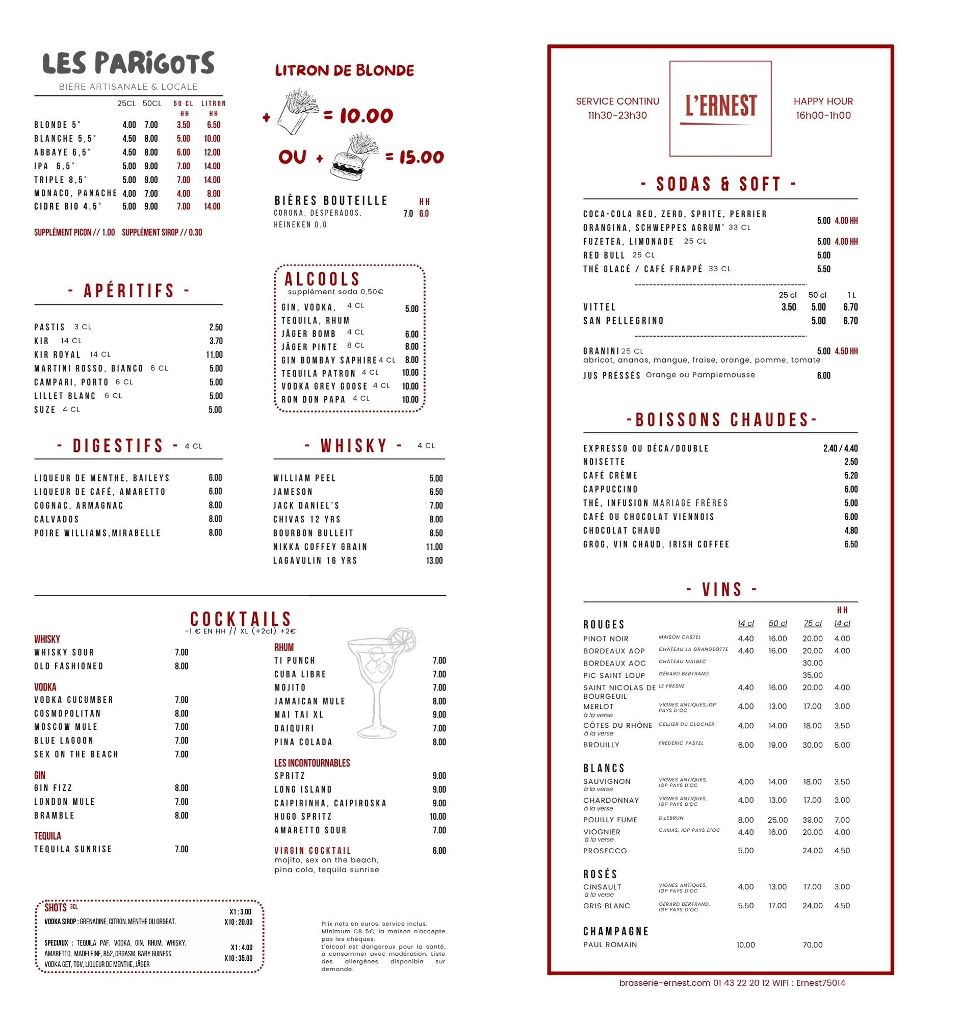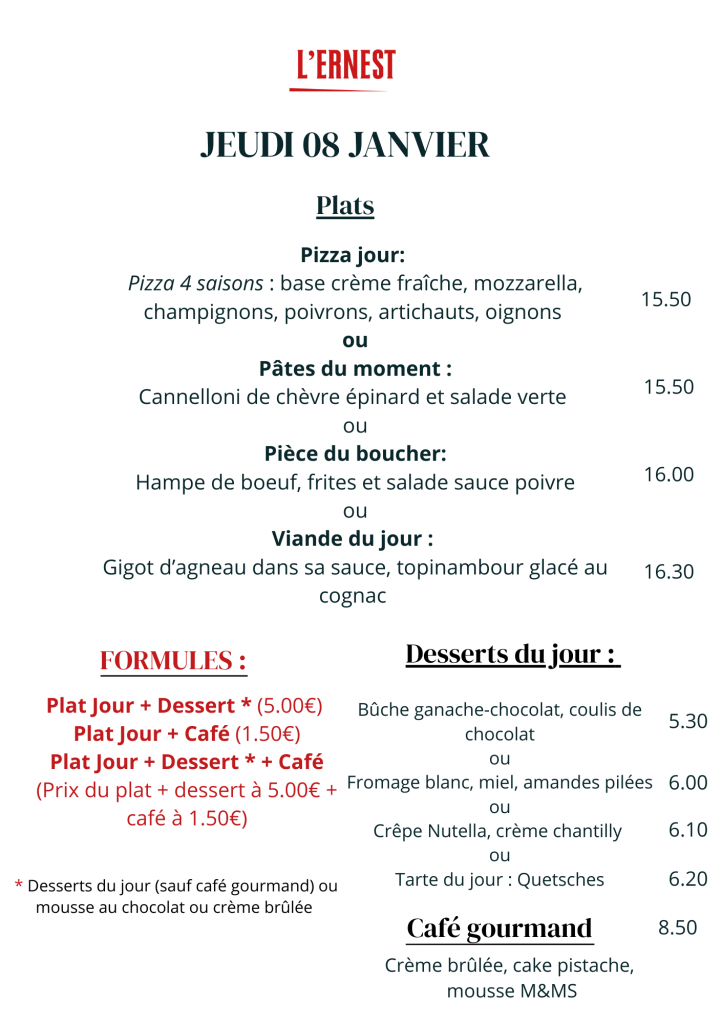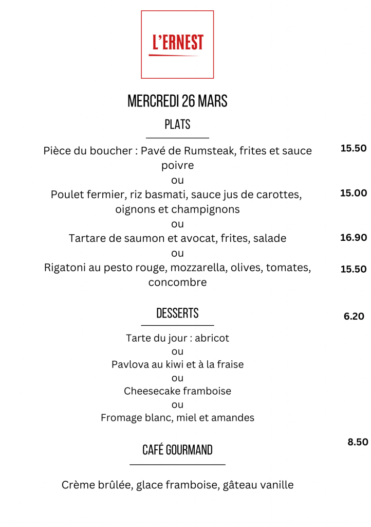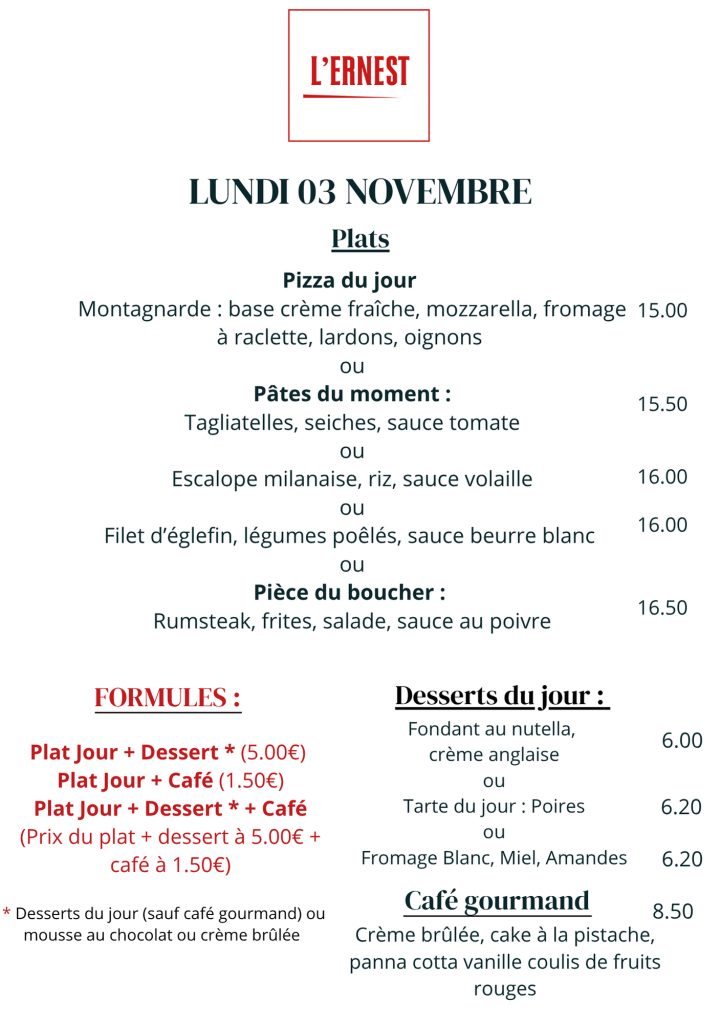 L’Ernest vous accueille du lundi au vendredi de 7h à 1h du matin et samedi et dimanche de 8h à 1h du matin (service continu de 11h30 à 23h30 tous les jours).